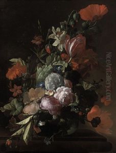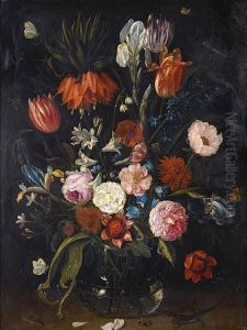 Tulips, Violets, Forget-me-nots And Other Flowers With Butterflies In A Glass Vase, On A Stone Ledge With A Cricket, A Stag Beetle And A Caterpillar
