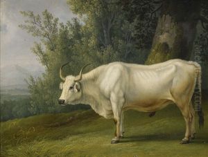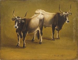 Liegende Weise Kuh Vor Landschaftlichem Hintergrund (+ Stehende Braune Kuh Vor Berggesaumter Ebene, Oil On Metal; Pair)