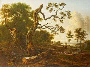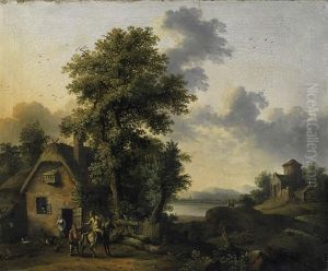 A Wooded River Landscape With A Woman On A Gray Horse With Animals Watering (+ A Wooded Riverlandscape With A Shepherd Resting Beneath A Tree By Cows And Goats; Pair)