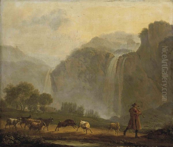 A Mountainous Landscape With A Shepherd And His Flock On A Track Before A Waterfall