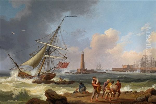 Der Hafen Von Livorno Mit Der Rettung Schiffbruchiger Im Vordergrund Und Einem Schlachtschiff Der Kaiserlich Russischen Flotte Unter Admiral Graf Orlow Im Hintergrund