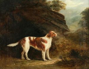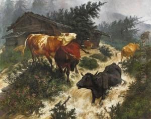 Liegende Weise Kuh Vor Landschaftlichem Hintergrund (+ Stehende Braune Kuh Vor Berggesaumter Ebene, Oil On Metal; Pair)