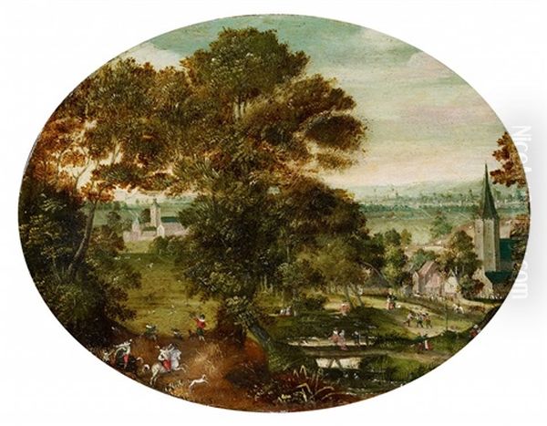 A Village Landscape With Hunters