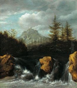 A River Landscape With Three Fishermen Near A Waterfall