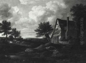 A Dune Landscape With Figures By The Side Of A Path, Thatched Cottages And A Church In The Distance