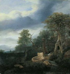 A Wooded Landscape With A Shepherd And His Flock Near A Waterfall, A Town Beyond