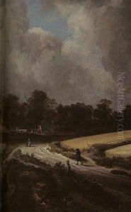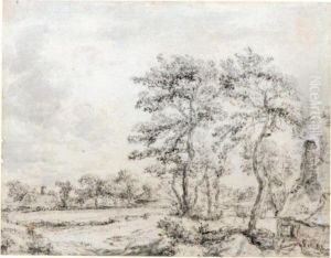A Wooded Landscape With Travellers On A Track And A Shepherd With His Flock
