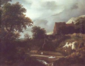 Landscape With A Waterfall, A Footbridge And Trees At The Margin Of A Wood Beyond