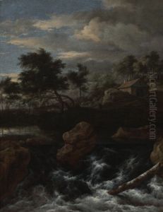 A Wooded River Landscape With A Waterfall And Travellers On A Bridge