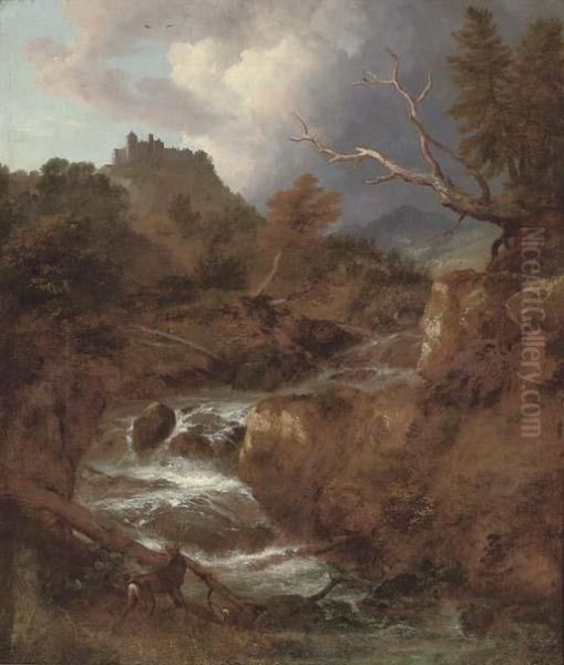 A Mountainous Wooded River Landscape With A Stag By A Waterfall, Bentheim Castle Beyond