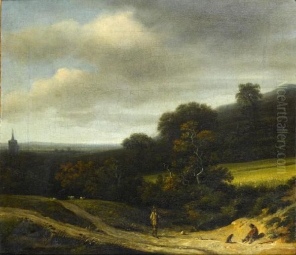 Wooded Landscape With Figures On A Sandy Road Before A Distant Town