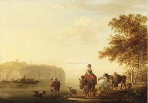Herders With Goats On A Track With A Mule And A Goat Overlooking A Lake In An Italianate Landscape