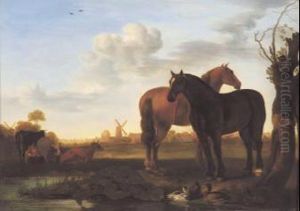 View Of A Farm By A Canal, With A Drover With His Horse And Cart And A Woman Drawing Water From A Well