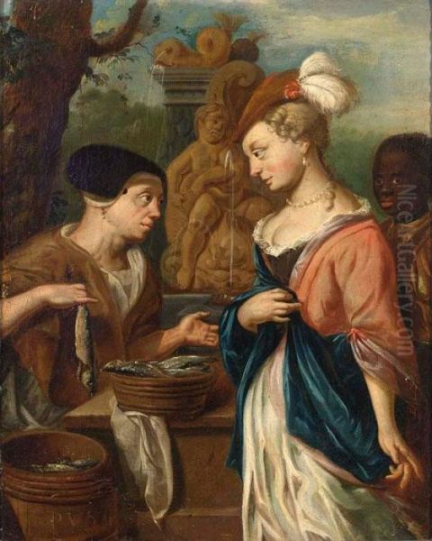 A Woman Selling Herring To An Elegant Lady And Her Servant, A Fountain Beyond
