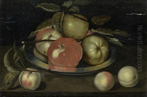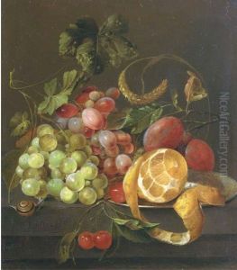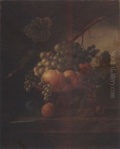 Apples, Grapes, Pears And Apricots On A Stone Ledge With A Butterfly And Spiders Nearby