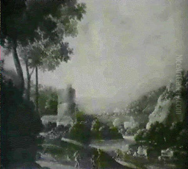 An Extensive River Landscape With Figures On A Path Before Afortress
