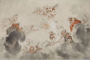 Ontwerp voor een plafondstuk met de apotheose van Aeneas. In de hoeken de vier jaargetijden in brunaille