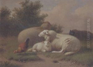 Ewe And Lambs Outside A Barn (+ Sheep And A Goat In A Landscape; Pair)