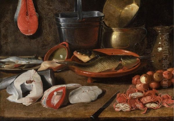 Still life with fish, kitchenware, crabs and onions