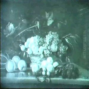 A Still Life Of Plums, Peaches And Grapes In A Basket On A Table, With A Tortoiseshell Butterfly
