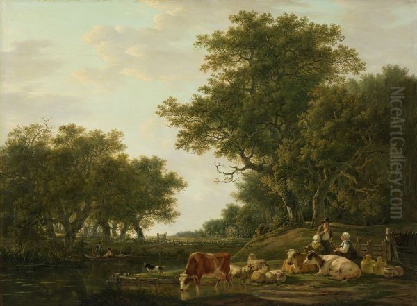 Landscape with peasants and their cattle and anglers on the water