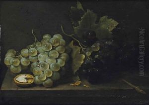 A Melon, Nuts And Corn On A Stone Ledge With Butterflies