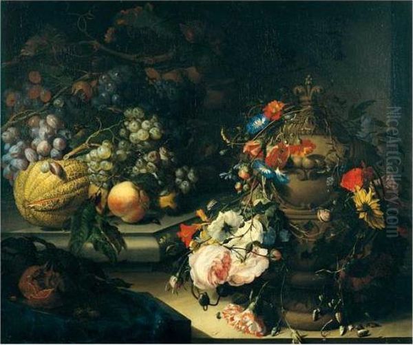 A Still Life Of Fruit On A Ledge And Flowers Decorating An Urn