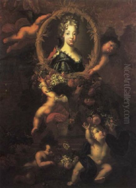 Portrait Of Maria Luisa Of Savoy, Queen Of Spain, In A Cartouche Decorated With Garlands, A Classical Landscape Beyond