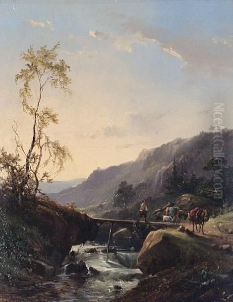 Travellers Crossing A Bridge In A Valley At Dawn