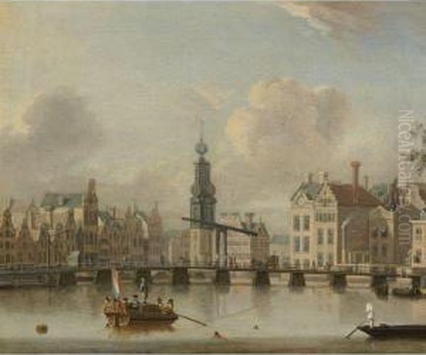 View Of Amsterdam With The Singel And Munttower, With Figurescrossing A Bridge And Swimming In The Foreground