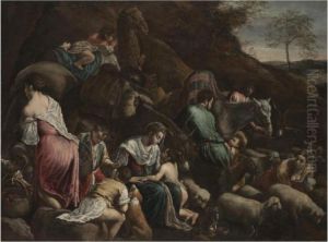 An Extensive River Landscape With A Huntsman And His Dogs, A Washerwoman With Chickens, Sheep And Goats Nearby