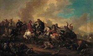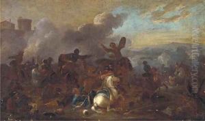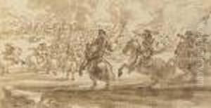 A Battle Scene With Cavaliers And Infantry Fighting Before A Fortified Town