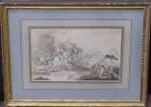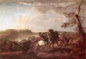 Trois Cavaliers Pres D'un Cheval Et Un Homme A Terre