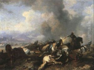 A Cavalry Engagement Before A Military Encampment