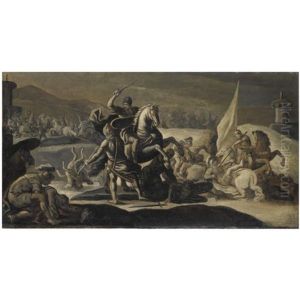 A Cavalry Skirmish On The Hills Above A Walled Town
