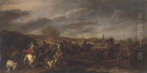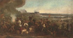 Battle Scene With Infantry, Cavalry And Cannon, A Fortress And A City Beyond