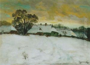 A Winter Landscape With Figures And A Dog On A Track, Cottages Beyond