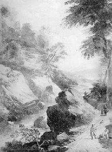 Travellers Leaving A Wood On A Country Path Beside A Waterfall