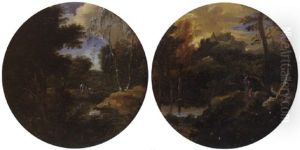 A Wooded Landscape With Huntsmen Resting In A Clearing By A Pond