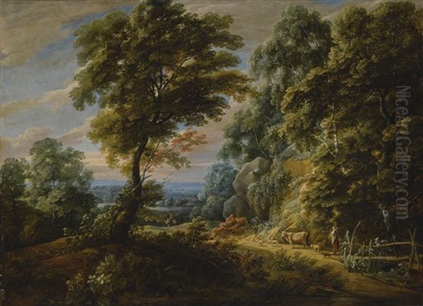 A Wooded Landscape With A Shepherdess Passing A Steep Bank, Probably On The Edge Of The Foret De Soignes