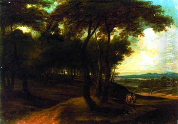 A Wooded Landscape With Figures On A Track