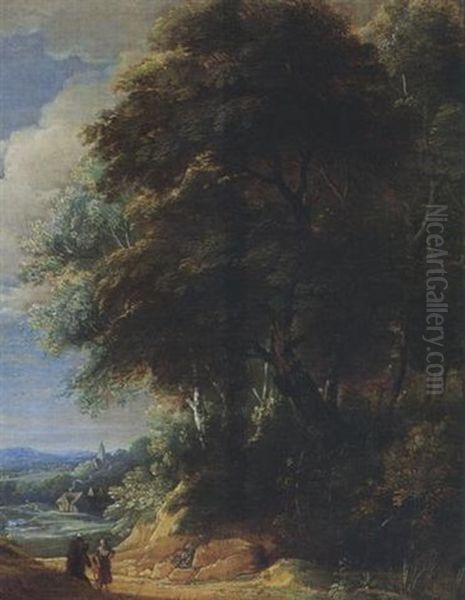 A Wooded Landscape With Two Travellers Conversing On A Path