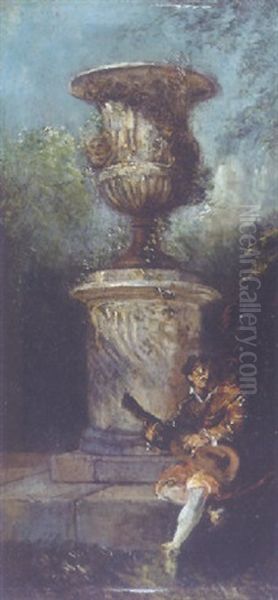 A Guitar Player Before A Classical Urn On A Pedestal