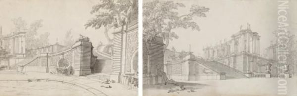 Deux Vues De Parc Et De Palais Avec Des Escaliers Dans Le Gout Rocaille