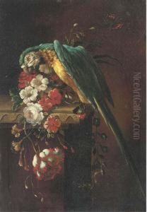 Still Life Of Flowers With Honeysuckle, A Daffodil, An Iris And Other Flowers In A Bronze Urn, Together With Pomegranates, Plums, Figs, Grapes And A Melon, All Resting On A Stone Ledge Together With A Parrot And Parakeet