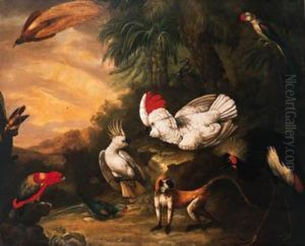 A Bird Of Paradise, A Moluccan And A Lesser Sulphar Crestedcockatoo, A Chattering Lory, A Banded Parakeet, A Crested Crane Anda Gibbon In A Tropical Landscape