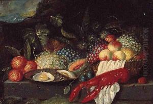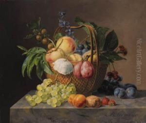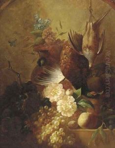 Grapes On The Vine And Peaches With Two Finches On A Ledge