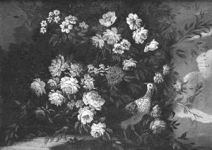 A Basket Of Flowers And A Macaw On A Wall By An Urn, A Landscape Beyond