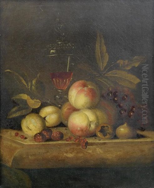 Peaches, Figs, Grapes, Redcurrants, Loganberries And A Glass Cup And Cover With Wine On A Stone Ledge