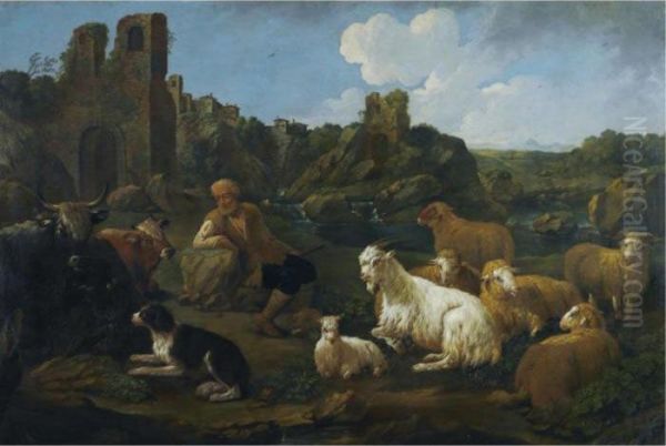A Landscape With A Herder, Cattle, Sheep And A Dog In The Foreground